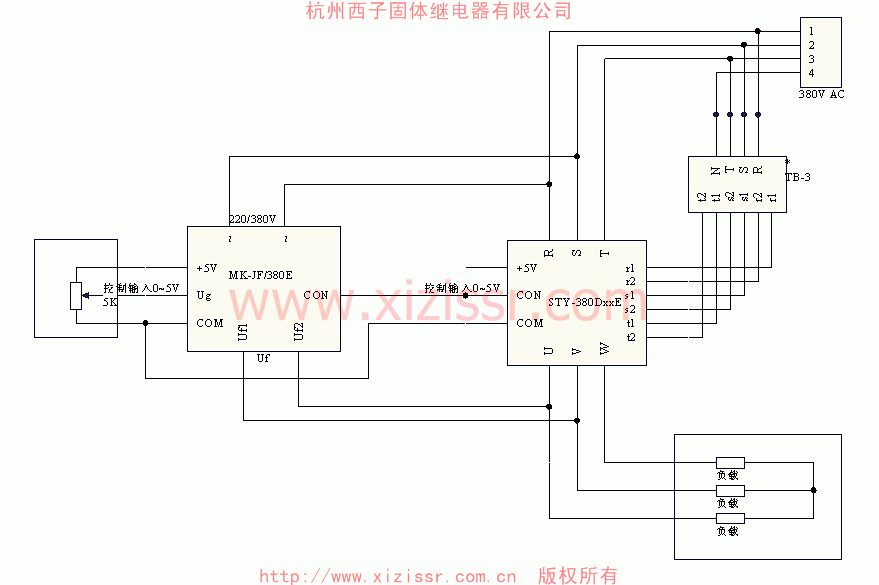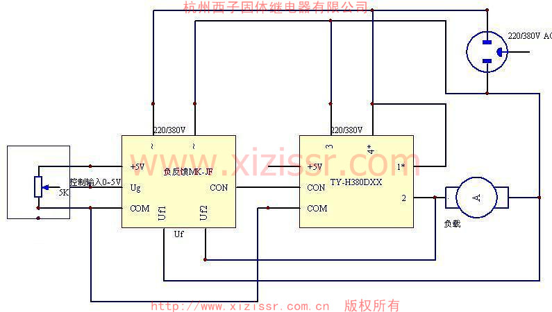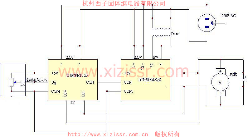 3、CON、COM、Ug、+5V端为弱电:其中COM为弱电"地";+5V为模块内部产生,仅供电位器手动控制时用(自动时+5V端悬空);Ug为给定的控制电压端,要求此信号输入范围为0-5VDC;CON为模块产生的控制电压端(0-5VDC)去控制相应的单相整流模块或整流电路的触发器。